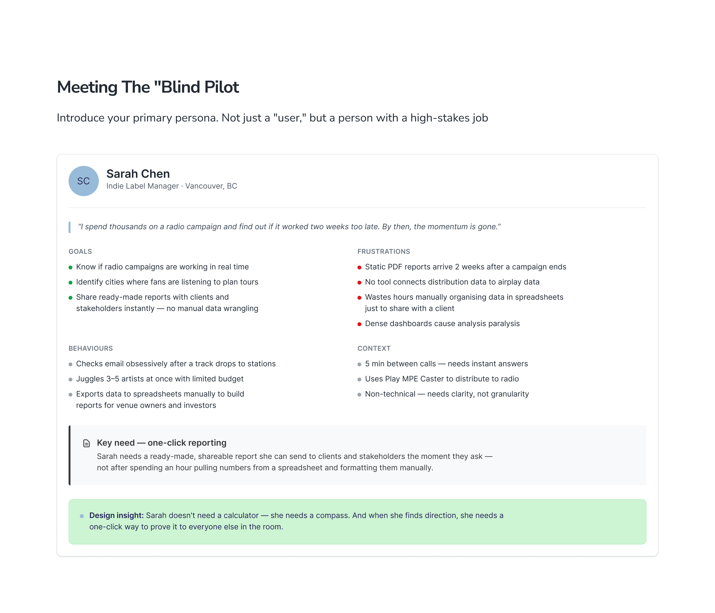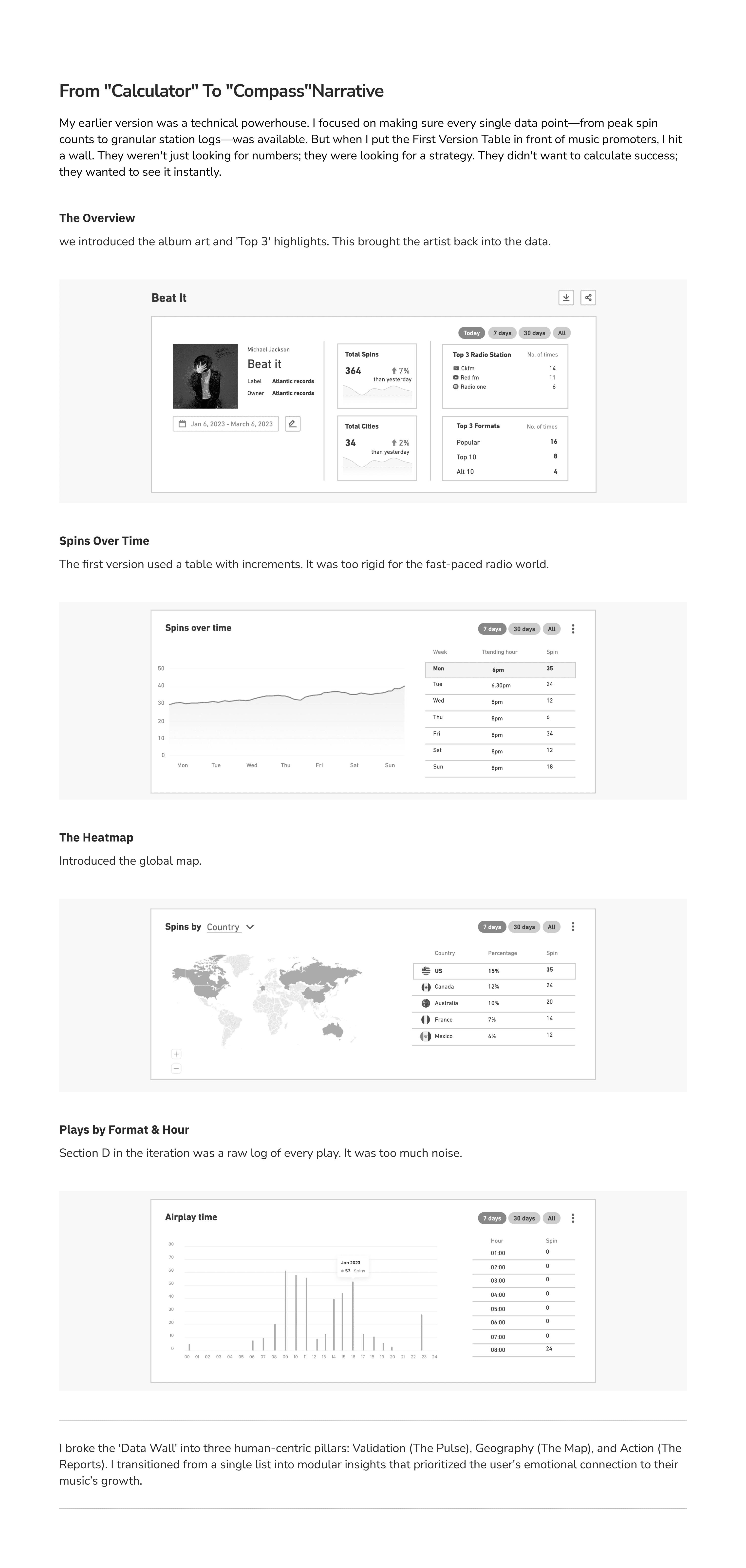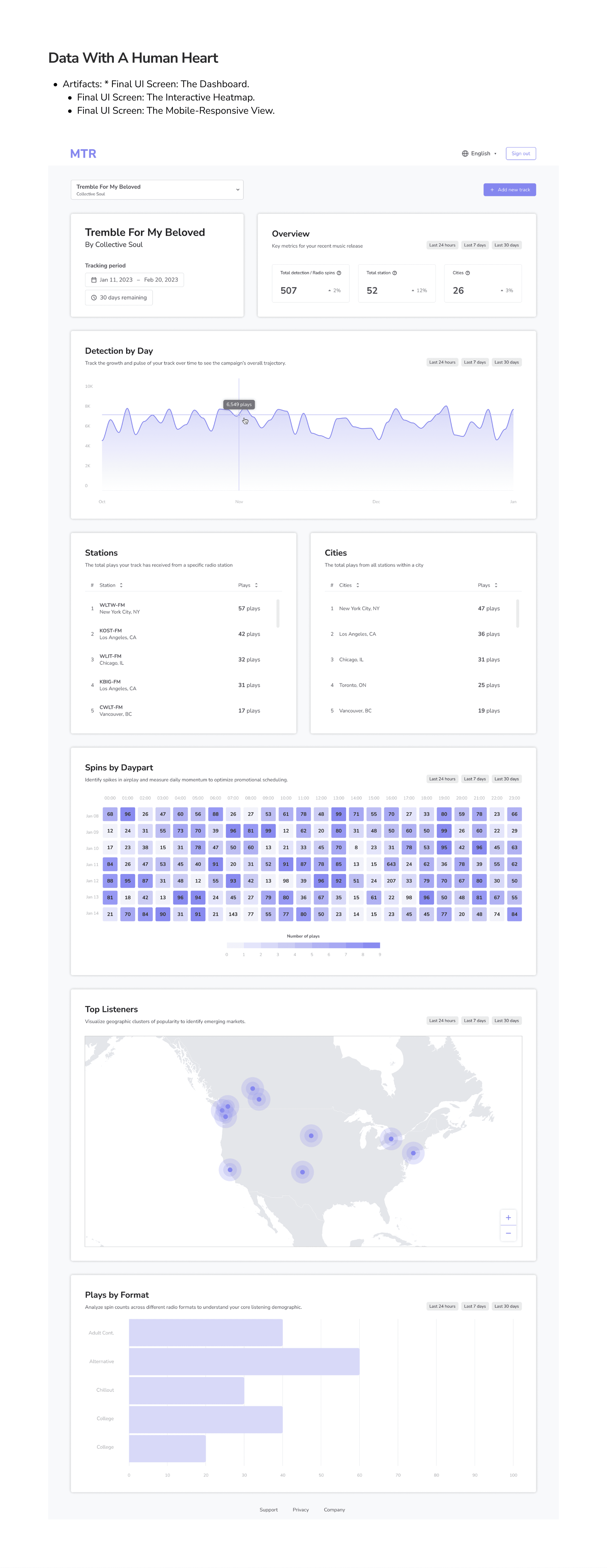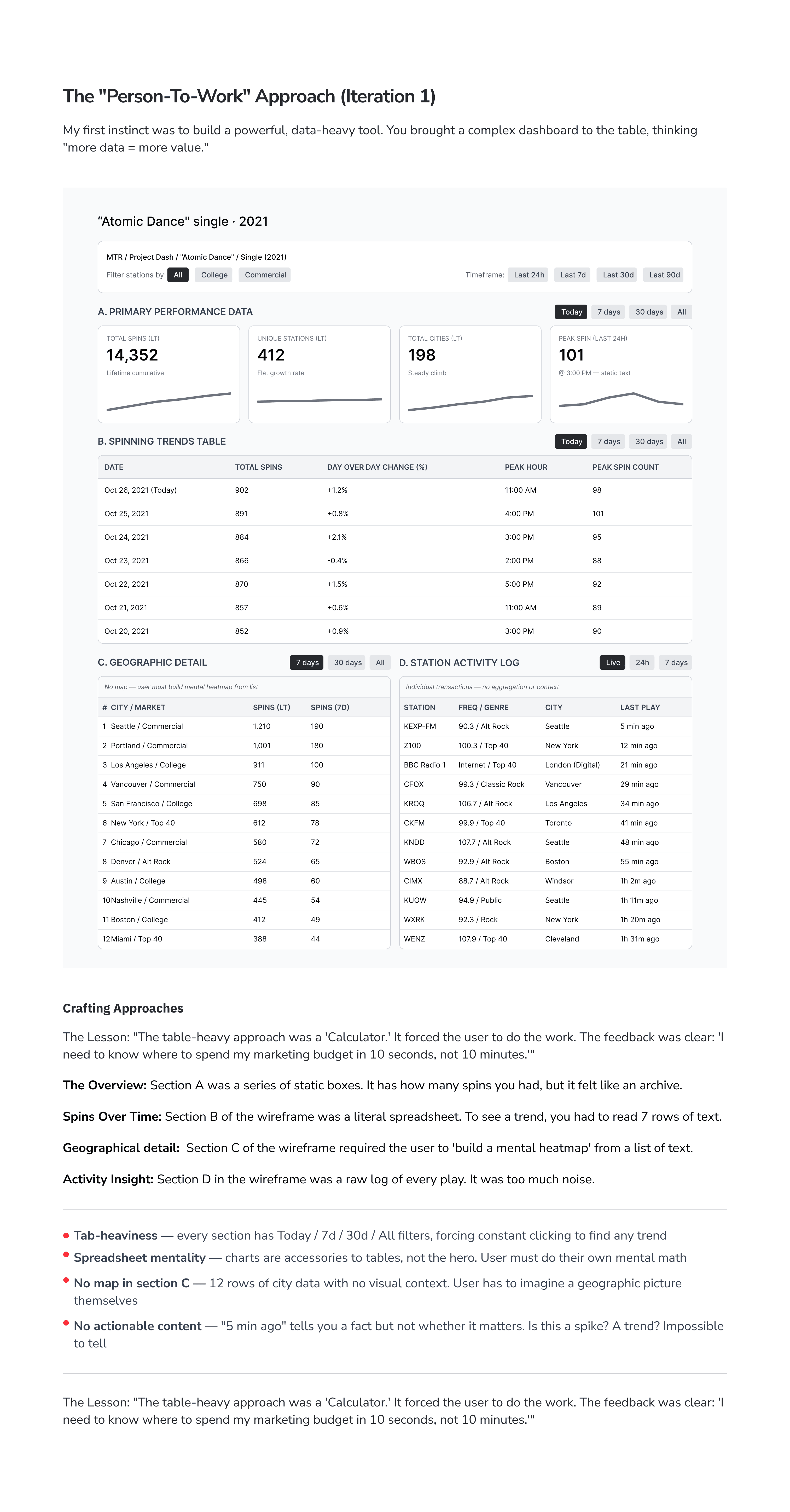 When we first started MTR (Music Tracking Radar), the goal seemed simple: build a powerful dashboard that showed radio spins. I initially designed a high-density, professional-grade interface—think Bloomberg Terminal, but for music. It was sleek, data-rich, and technically impressive.